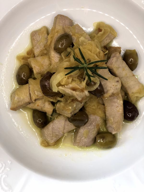 Brasare le cipolle a fuoco medio, con l’olio EVO , le olive taggiasche e il rosmarino. Aggiustare di sale e pepe, bagnare con il vino bianco e aggiungere il tonno tagliato a listarelle alzando la fiamma. Saltate per 1 minuto e il piatto è pronto !