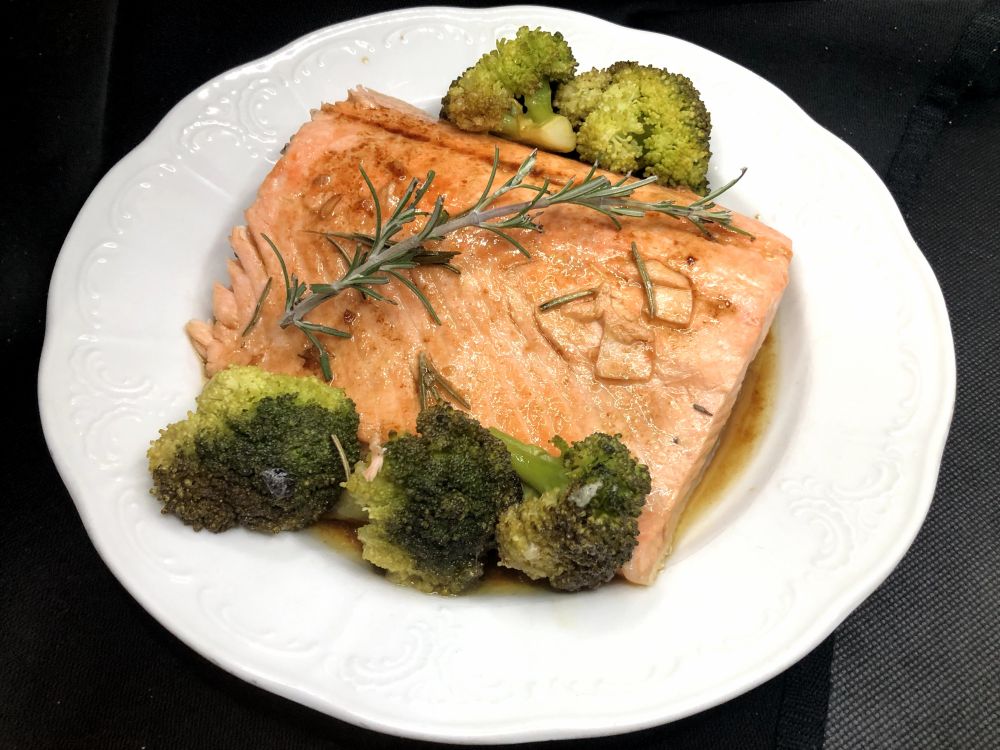 Scottate i tranci di salmone 3 minuti per lato in una padella antiaderente insieme al rosmarino.
