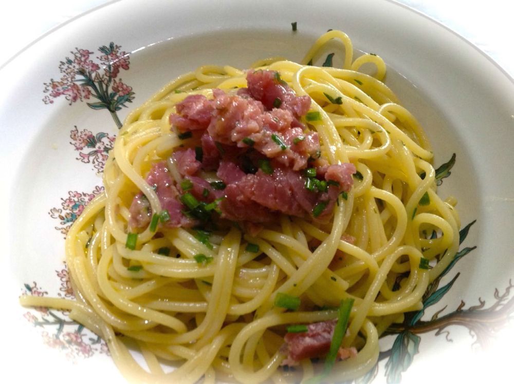 Unire la pasta al tonno Carthago e le uova e aggiungere un po’ di acqua di cottura in modo che i tuorli cuociano grazie al calore della pasta.