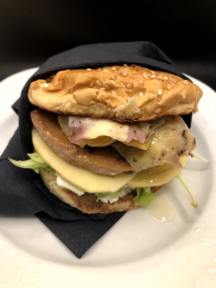 Scaldare il pane e iniziare la farcitura dal basso con Ricotta, insalata, mele tagliate a rondelle, burgher e carciofi tagliati a metà.